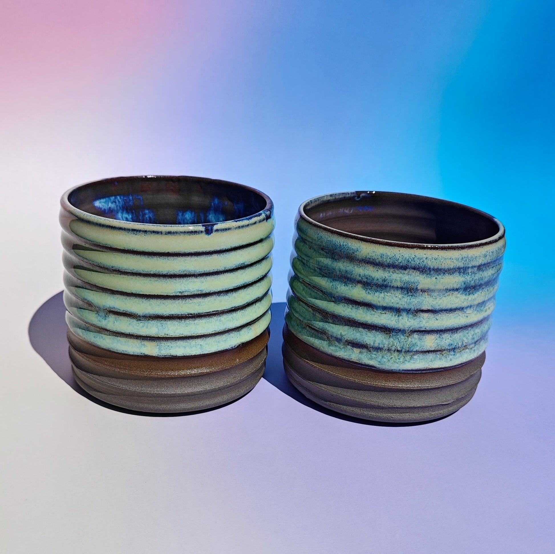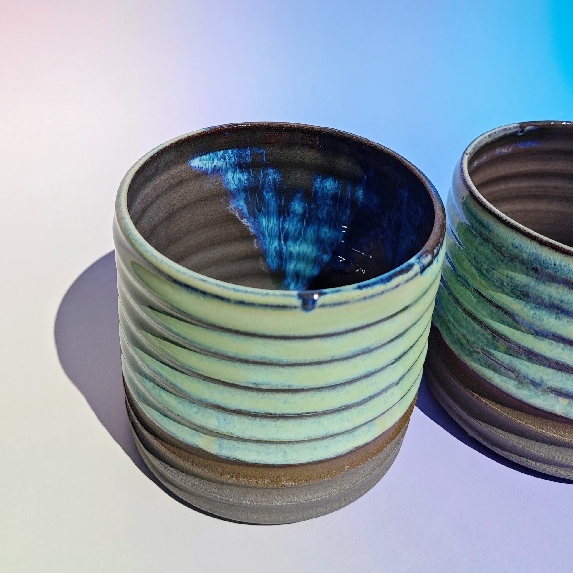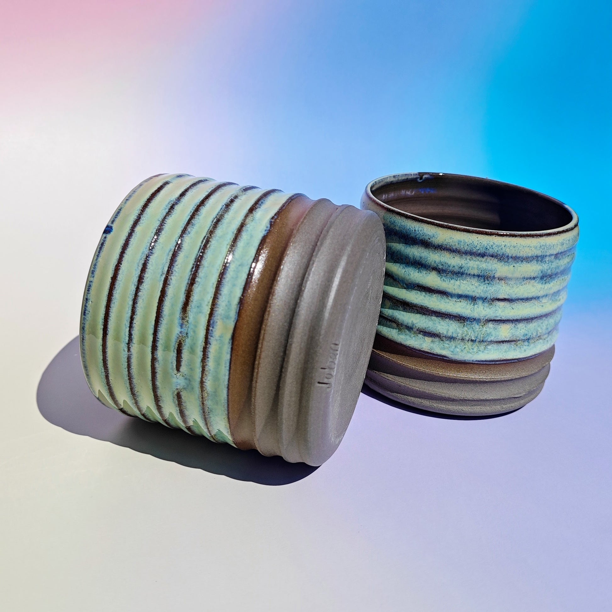 Liebevoll handgemachte Steinzeug-Keramik mit einer hellgrünen Glasur. Die strahlende Jana-Glasur ist ein fantastischer Kontrast zu dem anthrazitfarbenen Ton und der Becher liegt durch die Rillen wunderbar in der Hand.
