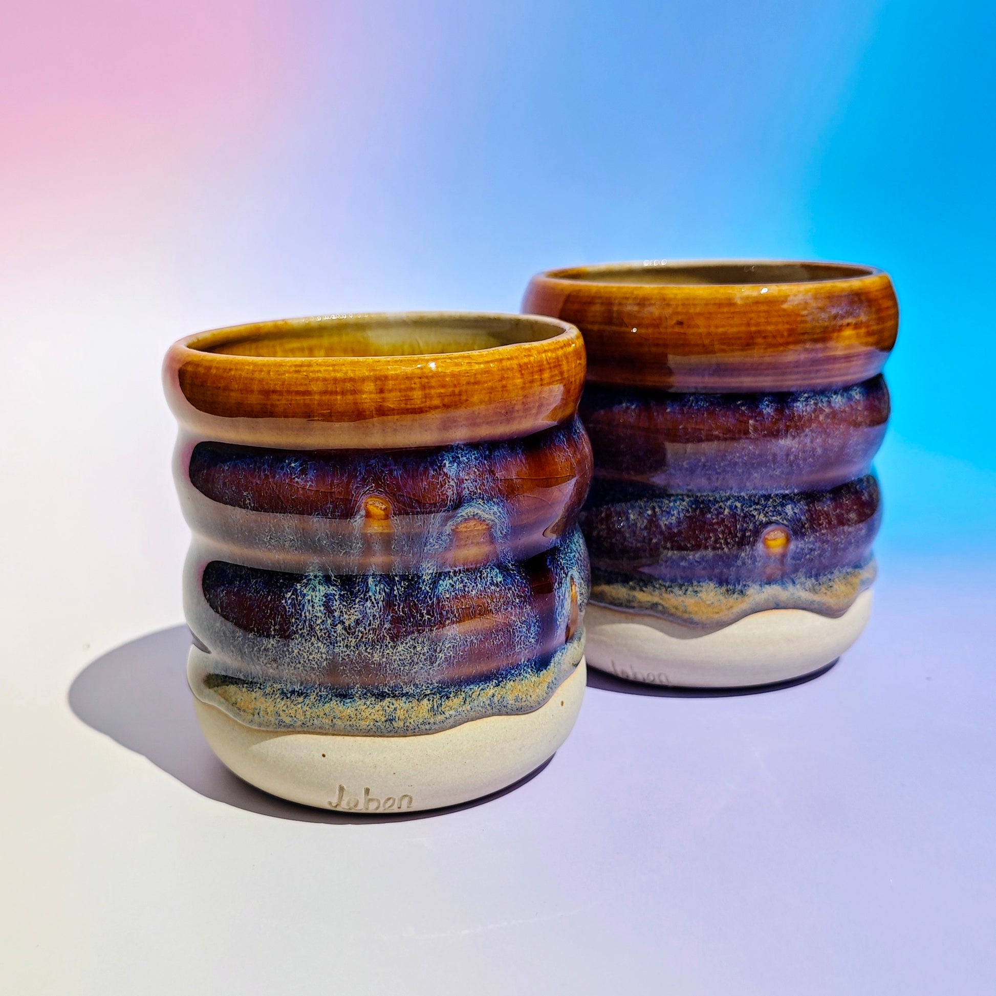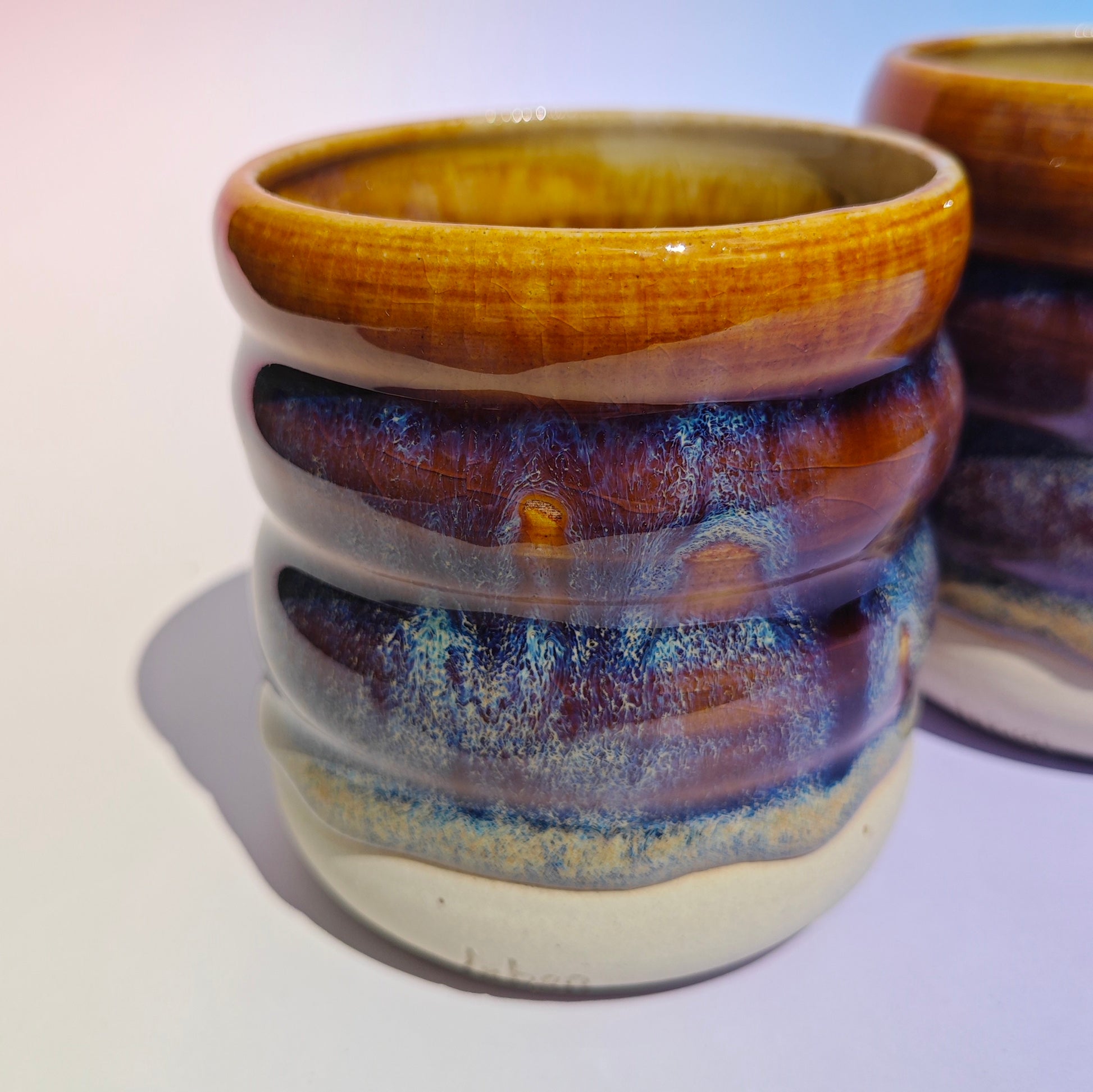 Hierin zeigt sich die Handarbeit: Jedes Stück ist ein Unikat und variiert leicht in Größe und Volumen. Auch die Glasur ist in ihrer Erscheinung immer ein bisschen anders - ein Verlauf von bernstein über blau, lila bis beige-grün ist möglich. Besonders an Kanten und Formen in der Keramik zeigt sich das einzigartige Farbspiel.