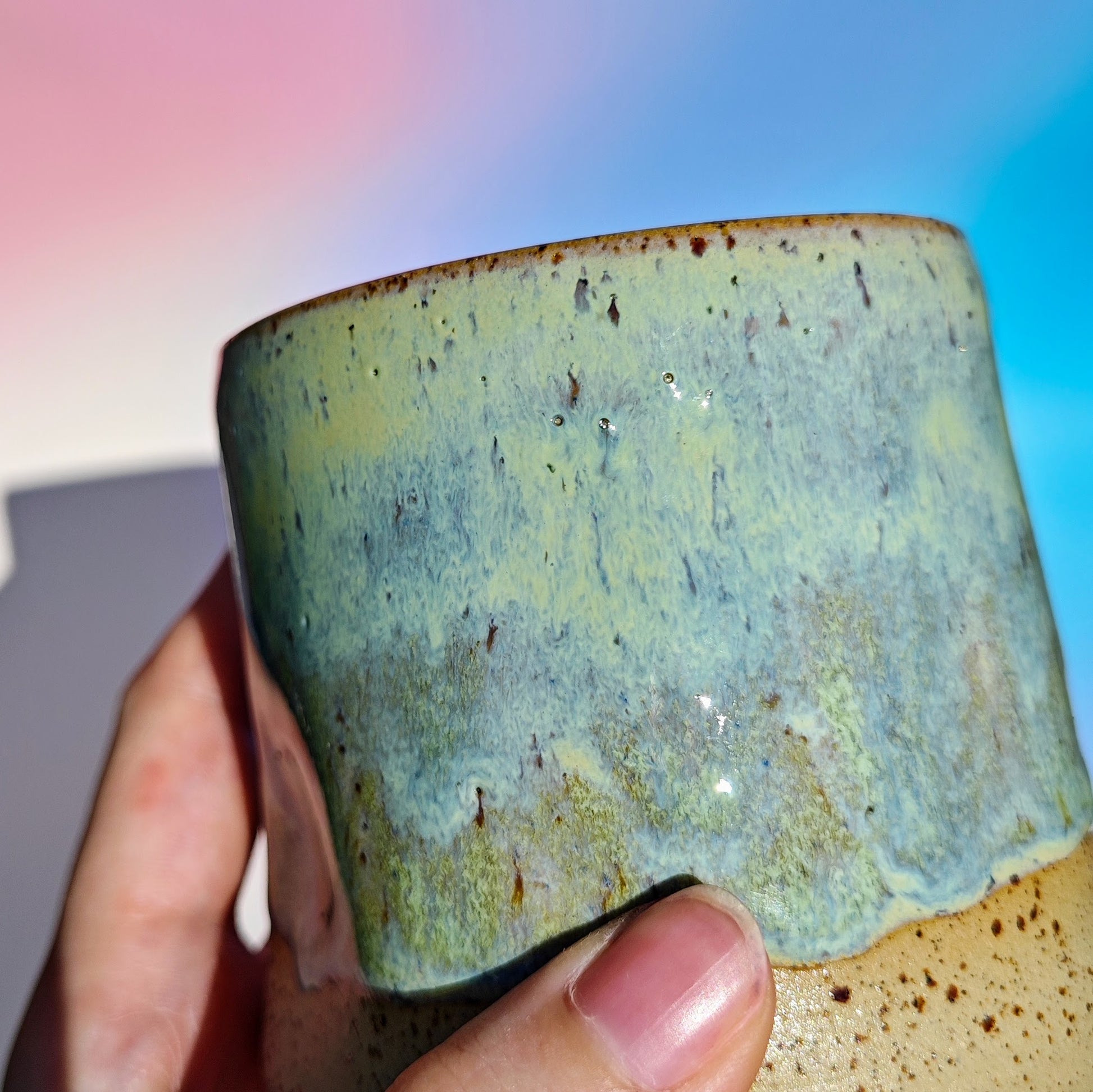 Die Glasur hat an manchen Stellen sog. "Nadelstiche" (siehe Fotos). Hierbei handelt es sich um einen rein optischen Makel und der Becher ist nicht in seiner Funktion eingeschränkt.